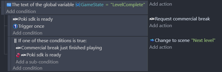 Ads can be displayed using either the Commercial break or Rewarded break actions. Please refer to Poki's implementation details to understand when to use one or the other.