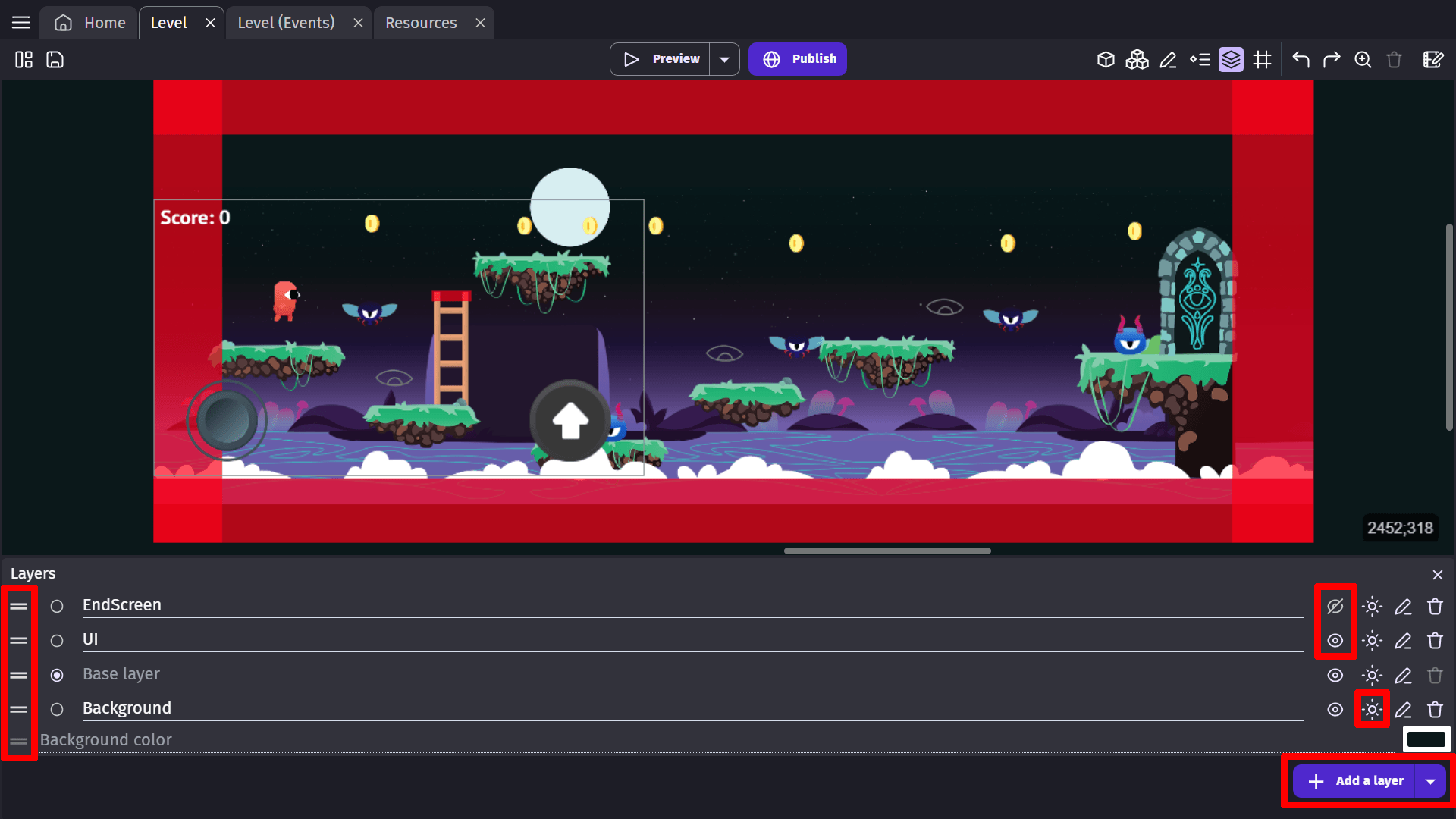 The visibility of a layer can be set to hidden or visible. Layers are visible by default, but this can be changed in either the Layers panel or by using events. Hiding a layer does not delete the objects on the layer. If a layer is hidden, all the objects on the layer exist and can interact with the objects on other layers, but they are not displayed on the screen.