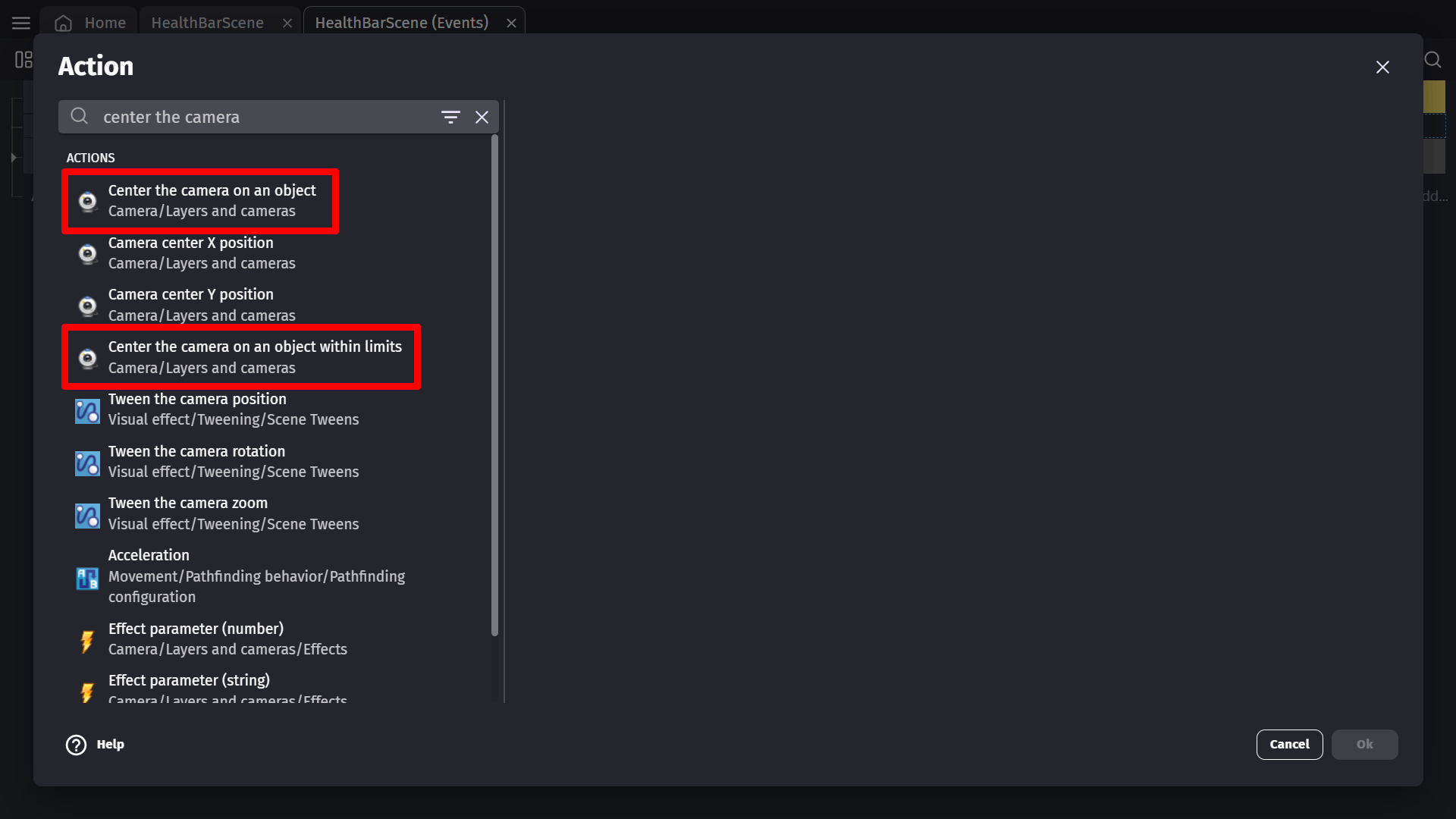 Many games use a moving camera but they also must prevent the camera from displaying an area outside the game's boundaries. This can be accomplished by using the Enforce camera boundaries action after all other camera movement actions.
