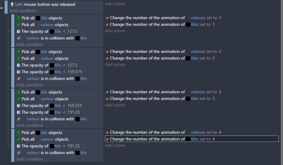 Next, create a new event then give it the condition of the left mouse button released. Then, create a sub event on the mouse button released event with the condition of pick all tile objects and the opacity of tile is \< 127.5. Finally, add an action to change tile animation to 1.